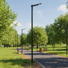 Двухуровневый осветительный комплекс Тверь Гала 7-2-15 РВ высотой семь метров отличается конструкцией с верхней консолью под углом пятнадцать градусов. Нижняя консоль проектируется по индивидуальным требованиям заказчика с выбором высоты и угла наклона. Каждая консоль оборудована двумя светодиодными модулями мощностью тридцать восемь ватт, формируя суммарную мощность освещения семьдесят шесть ватт. Производитель предлагает два визуальных исполнения: с консолями, завершающимися в пределах ствола, и с консолями, выходящими за его визуальные границы. Конструкция характеризуется фланцем диаметром двести миллиметров с четырьмя монтажными отверстиями для надежной установки. Производство соответствует ГОСТ 23118-2018 с гарантированным сроком службы тридцать лет.